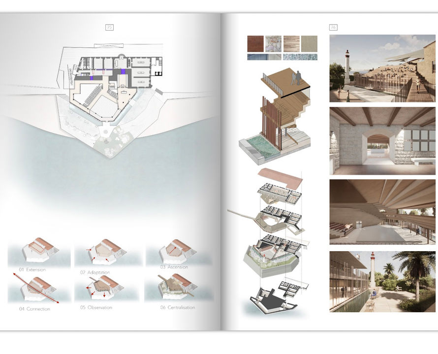 After conducting a thorough analysis, I identified several challenges related to this complex, such as its connection with the city, as well as its central location within the city. Moreover, the lack of cultural and higher educational establishments motivated me to transform it into a center accessible to all, offering a shop window for the craft industry, an insular art wing from the University of Corsica, a museum about the city, an auditorium, artists' accommodation, and a fablab.